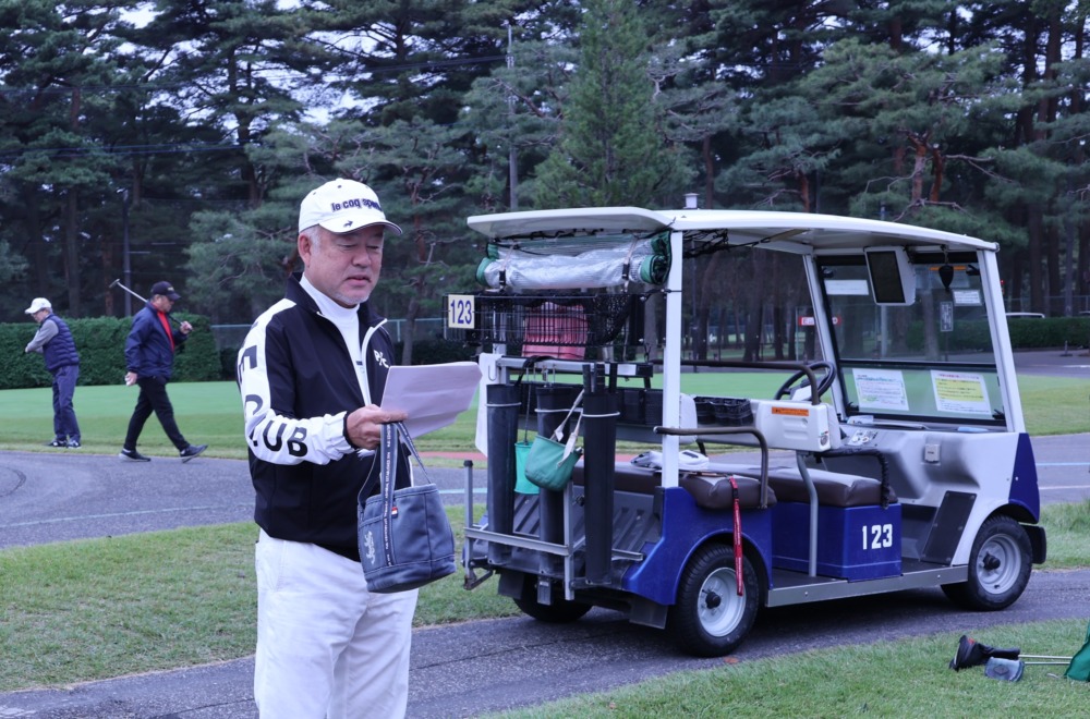 集合写真撮影の後、坂元隆也会長より大いに楽しんでくださいと挨拶、そして川辺日出海実行委員長からルール説明を受けてアウト、イン8組に分かれてスタートです。アウトコースは坂元隆也会長、インコースは岩元副会長の始球式でプレーが開始されました。
